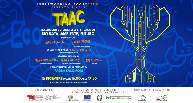 E proprio per rivolgersi alle scuole, ART-ER ha scelto Radioimmaginaria, la radio degli adolescenti, per presentare il contest “TAAC – Il premio dell’Innovazione” e creare un’occasione di dialogo e confronto per i ragazzi di età 14-19. Le squadre si sfideranno per scoprire come i Big Data cambieranno il nostro futuro, contribuendo a migliorare l’impatto ambientale e a creare una società più resiliente. Ogni squadra dovrà creare dei contenuti comunicativi efficaci utilizzando il proprio linguaggio, quello degli adolescenti, per poter vincere la box premi in palio.